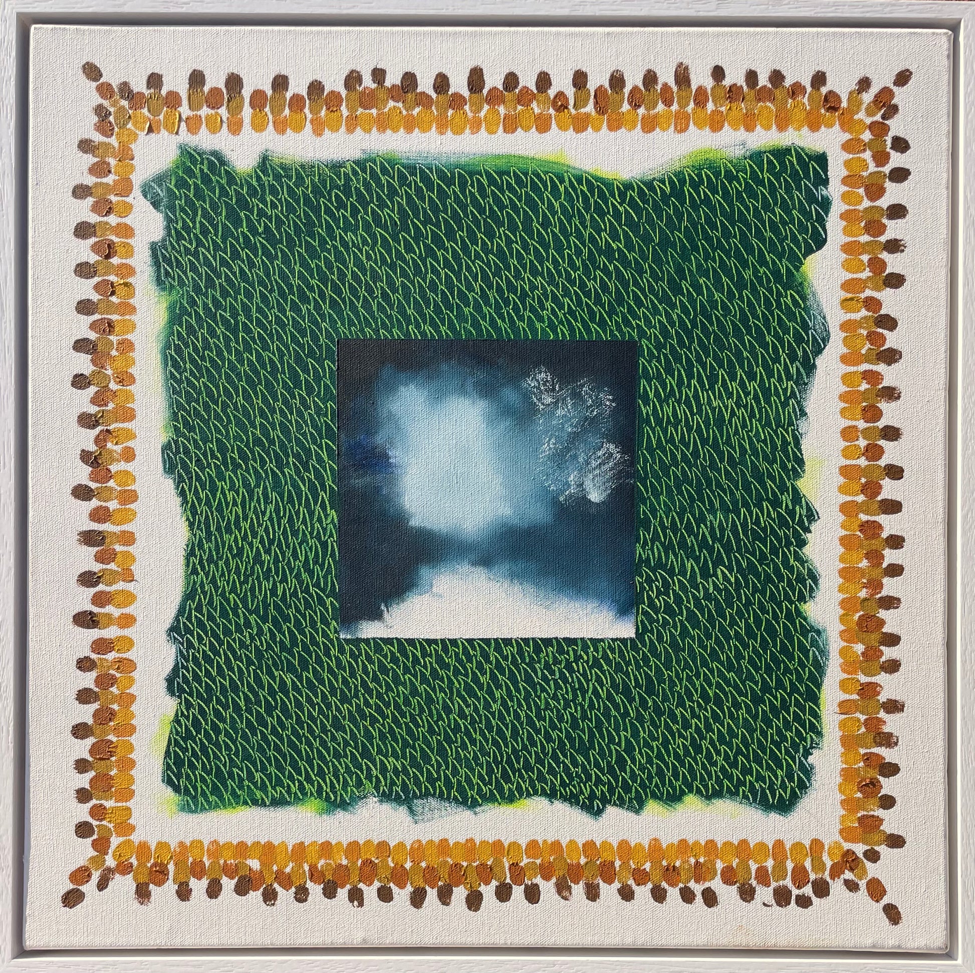 A Little Bit of Everything Medium by postmodern artist Anthony Lawrence is an evocative oil on canvas from 1996, measuring 53.7 x 53.7 cm. The composition features a central motif of clouds, framed by a richly textured green surround that transitions to warm yellows and browns at the edges. This carefully balanced palette and textured layering exemplify Lawrence's nuanced approach to abstraction, inviting viewers to explore the interplay of natural elements and colour dynamics within a harmonious spatial arrangement.