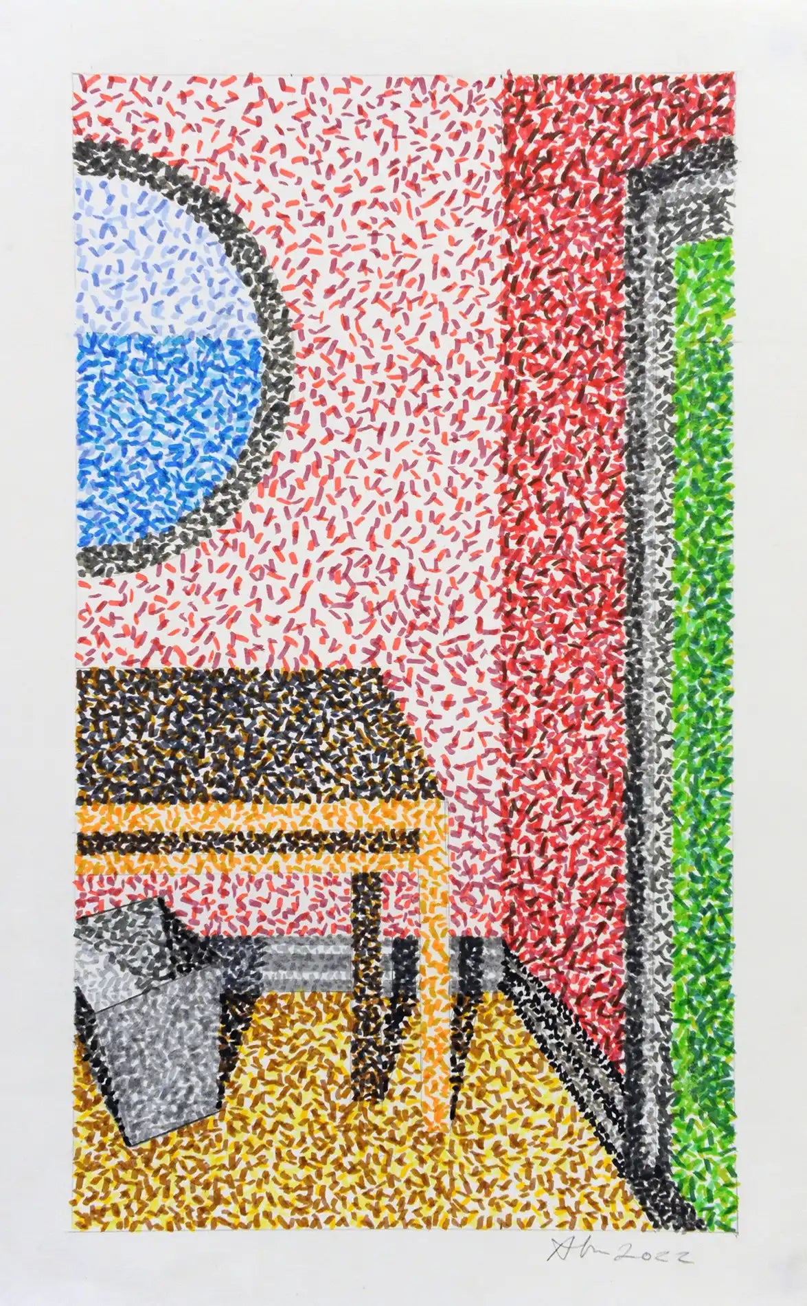 Corner of My Small Sitting Room No.1 by artist Anthony Lawrence captures an intimate interior scene with a distinctive postmodern flair. Measuring 44cm by 31cm, this 2022 pen-on-paper artwork features a vibrant colour palette highlighting a porthole window overlooking the ocean, alongside a table, doorway, and the room’s corner. The composition’s nuanced details and bold hues create a dynamic perspective that invites close examination. It exemplifies Lawrence’s ability to blend architectural elements with vivid expressiveness in a compact format.