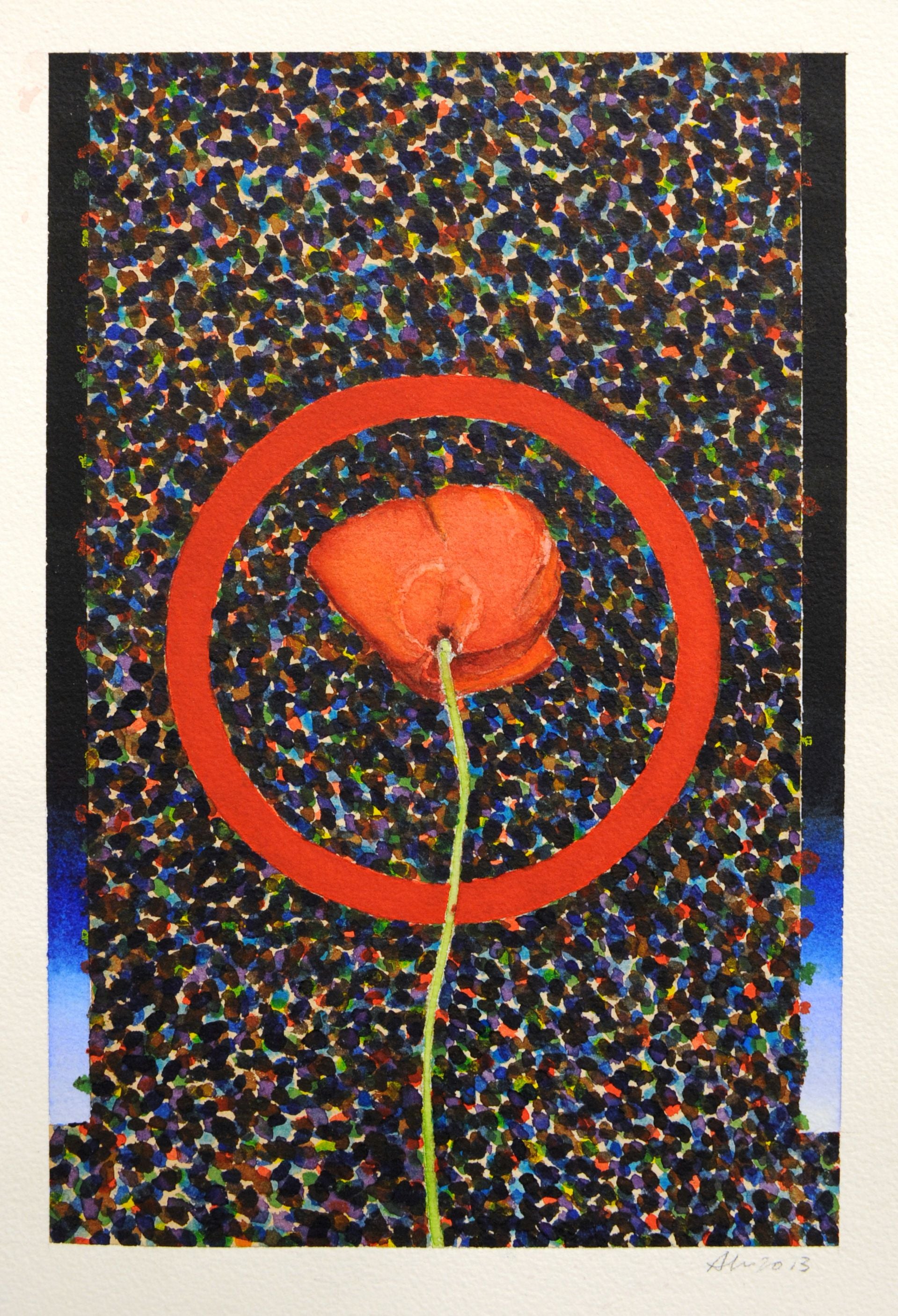 Created in 2013 by postmodern artist Anthony Lawrence, "Poppy Study" is a watercolour painting that highlights a vivid red poppy accented by a red circle, set against a distinctive spotty black background.